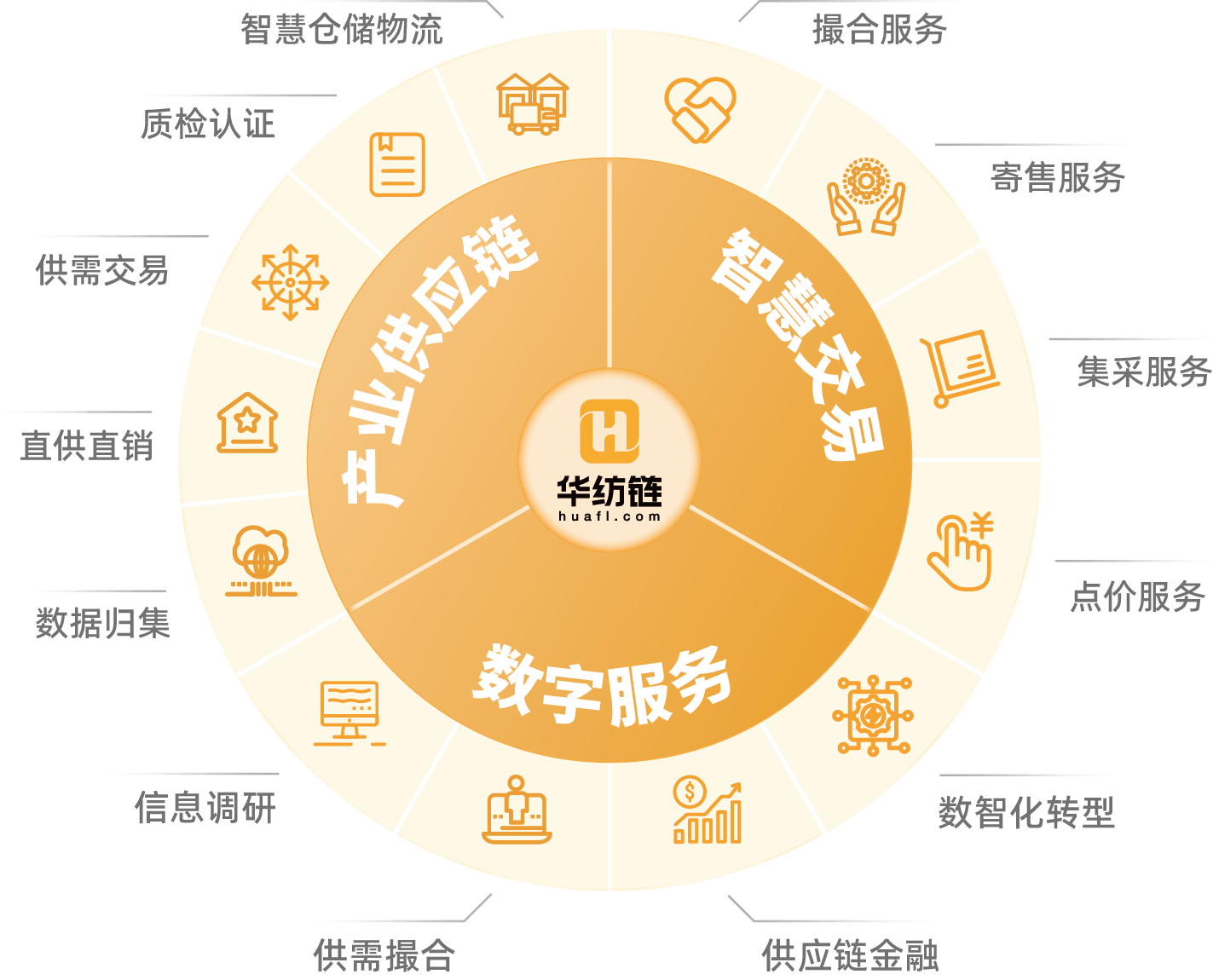 华纺链以“平台+供应链服务”作为切入,,,,围绕“原料+面料+辅料+成衣”等业务场景,,,通过大数据、、、、区块链、、、人工智能等数字技术,,,,为纺织服装产业上下游企业提供在线撮合、、、智能交易、、、数字工厂、、、供应链融资、、政策服务、、、、质检服务、、、设计师对接、、、电商供应链服务等一站式综合服务,,,帮助企业有效降低成本、、、提升效率、、实现业务增长。。。。