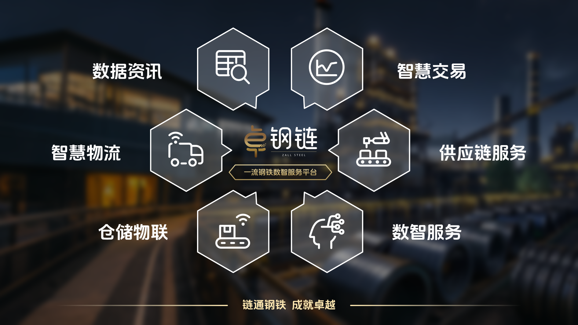 卓钢链依托“平台、、、、技术、、、服务”三驾马车,,构建了集“智慧交易、、、、供应链服务、、、数智服务、、、、仓储物联、、智慧物流、、、数据资讯”六大服务于一体的钢铁数智服务平台。。。目前在全国拥有50个服务中心,,业务辐射32省市310+城市,,,,服务全产业链客户7.5万家,,,覆盖全国96%主流钢厂。。。。以实际行动高质高效推动 产业数字化 、、 数字产业化 发展,,,致力成为推动产业发展与进步的积极力量。。